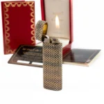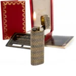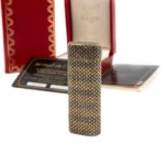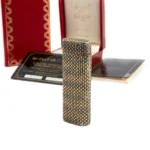 This lighter has been customized with a handmade solid 18-karat gold sleeving by an Italian goldsmith back in the day, roughly in the 80s judging by the style. The outer jacket is made by weaving thin gold and silver pieces around the lighter. The original 750 gold hallmark can be viewed at the bottom. The lighter comes in at a heavy 99 grams (A regular Les Must lighter weighs ~85 grams).