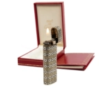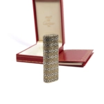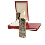 This lighter has been customized with a handmade solid 18-karat gold sleeving by an Italian goldsmith back in the day, roughly in the 80s judging by the style. The outer jacket is made by weaving thin gold and silver pieces around the lighter. The original 750 gold hallmark can be viewed at the bottom. The lighter comes in at 98 grams, over 20 grams heavier than a sleeveless Cartier lighter.