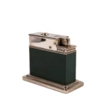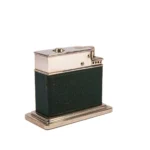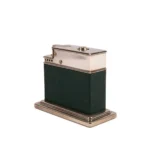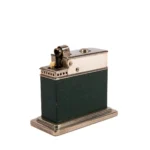 This Myflam table lighter is in great condition for its age. Made in Germany in the 1950s. Almost no wear to its corners and edges, and the paint on the bottom is also in great condition (which gets damaged easily). The lighter works with the push of a button on the top. Sparks great, every time. Just fuel it up and enjoy! The lighter is beautifully decorated with green leather on chrome. A beautiful testament to the charm of the Art-Deco movement. No engraving on the body.