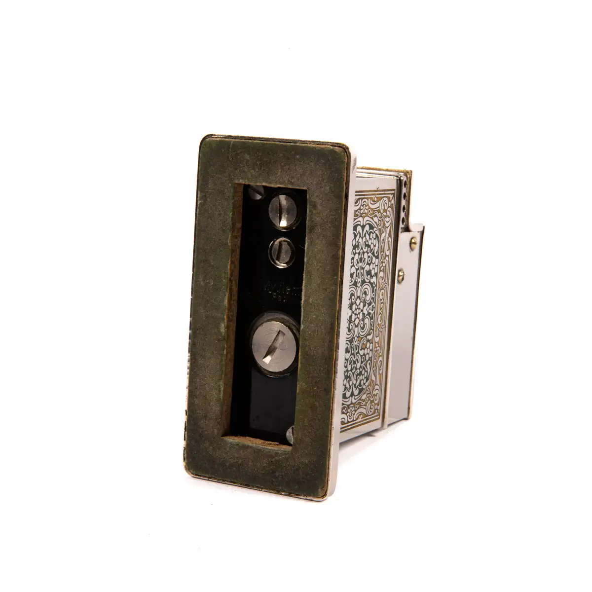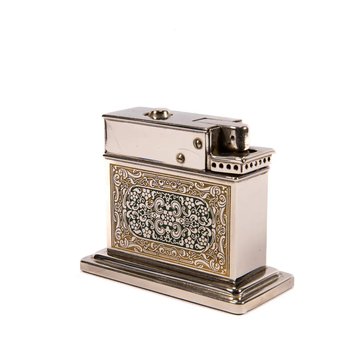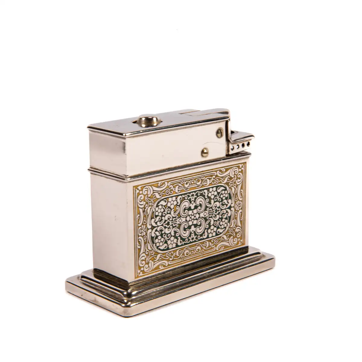 This Myflam table lighter is in great condition for its age. Made in Germany in the 1950s. Almost no wear to its corners and edges, and the paint on the bottom is also in great condition (which gets damaged easily). The lighter works with the push of a button on the top. Sparks great, every time. The lighter is beautifully decorated with enamel on chrome. A beautiful testament to the charm of the Art-Deco movement. No engraving on the body.